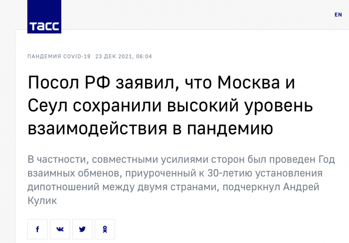 Посол РФ заявил, что Москва и Сеул сохранили высокий уровень взаимодействия в пандемию